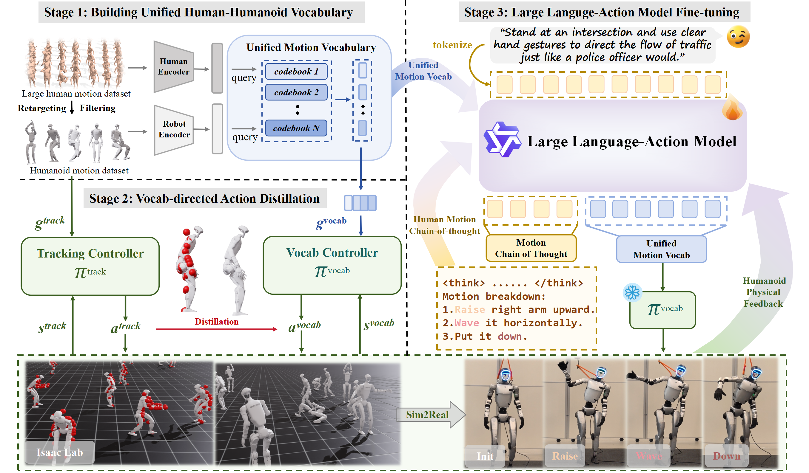 Enabling humanoid robots to follow free-form language commands is critical for seamless human-robot interaction, collaborative task execution, and general-purpose embodied intelligence. While recent advances have improved low-level humanoid locomotion and robot manipulation, language-conditioned whole-body control remains a significant challenge. Existing methods are often limited to simple instructions and sacrifice either motion diversity or physical plausibility. To address this, we introduce Humanoid-LLA, a Large Language Action Model that maps expressive language commands to physically executable whole-body actions for humanoid robots. Our approach integrates three core components: a unified motion vocabulary that aligns human and humanoid motion primitives into a shared discrete space; a vocabulary-directed controller distilled from a privileged policy to ensure physical feasibility; and a physics-informed fine-tuning stage using reinforcement learning with dynamics-aware rewards to enhance robustness and stability. Extensive evaluations in simulation and on a real-world Unitree G1 humanoid show that Humanoid-LLA delivers strong language generalization while maintaining high physical fidelity, outperforming existing language-conditioned controllers in motion naturalness, stability, and execution success rate.